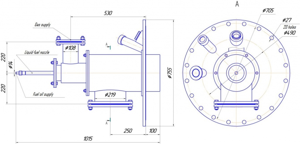 Габаритный чертеж комбинированного газожидкостного горелочного устройства